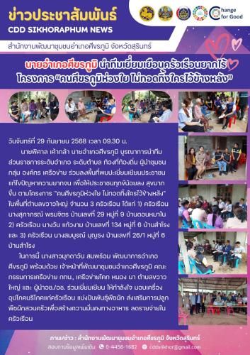 นายพิศาล เค้ากล้า นายอำเภอศีขรภูมิ บูรณาการนำทีมส่วนราชการระดับอำเภอ ระดับตำบล ท้องที่ท้องถิ่น ผู้นำชุมชน กลุ่ม องค์กร เครือข่าย ร่วมลงพื้นที่พบปะเยี่ยมเยียนประชาชน แก้ไขปัญหาความยากจน เพื่อให้ประชาชนทุกข์น้อยลง สุขมากขึ้น ตามโครงการ “คนศีขรภูมิห่วงใย ไม่ทอดทิ้งใครไว้ข้างหลัง” ในพื้นที่ตำบลขวาวใหญ่ จำนวน 3 ครัวเรือน ได้แก่ 1) ครัวเรือน นางสุภาภรณ์ พรมจิตร บ้านเลขที่ 29 หมู่ที่ 9 บ้านดอนหมาใน 2) ครัวเรือน นางวัน แก้วงาม บ้านเลขที่ 134 หมู่ที่ 6 บ้านสำโรง และ 3) ครัวเรือน นางสมบูรณ์ บุญธง บ้านเลขที่ 26/1 หมู่ที่ 6 บ้านสำโรง